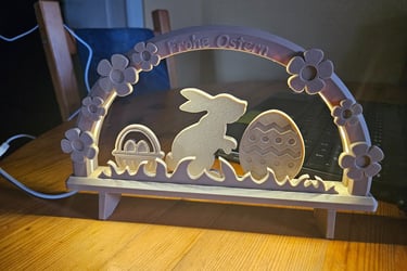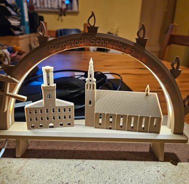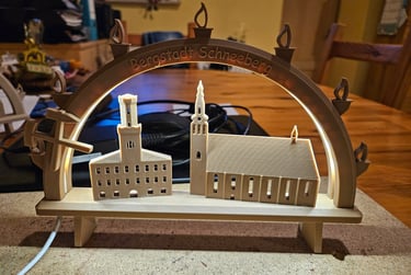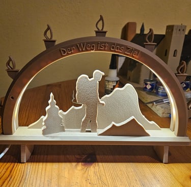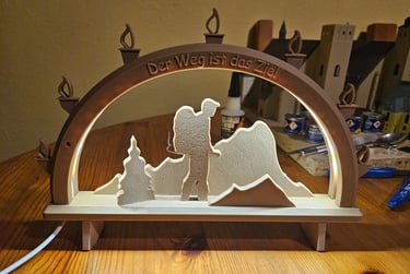 Unser Schwibbogen ist 25cm breit und ca. 17,5cm hoch. In den Bogen ist ein dimmbares LED-Band eingesetzt. Dieses kann weiß, warmweiß oder kombiniert eingestellt werden.
