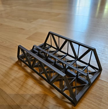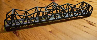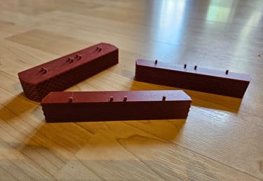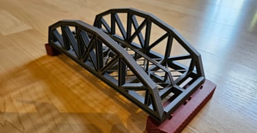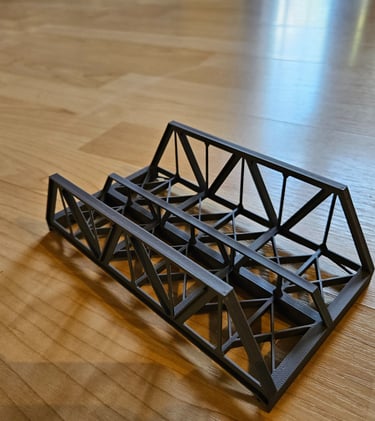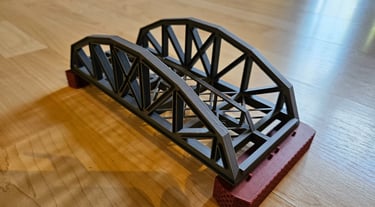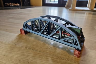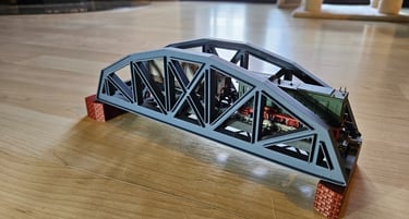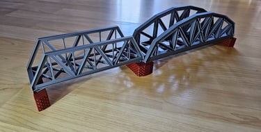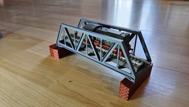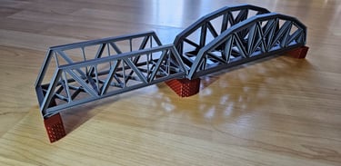 Die Brücke ist 166mm lang, 51mm breit und 50mm hoch. Innere Breite 40mm. Die Pfeiler sind optional. Es gibt Rand- und Mittelpfeiler. Sie sind 20mm hoch und können endlos erhöht werden. Durch den Mittelpfeiler können endlos viele Brückenelemente verbunden werden.