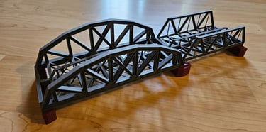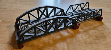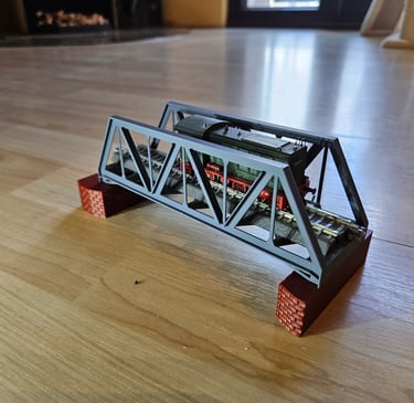 Die Brücke entspricht keinen Vorbild. Sie ist 550mm lang, 58mm breit und 120mm hoch. Die Aussparung für das Gleis ist 32mm breit und bietet 55mm Platz nach oben.