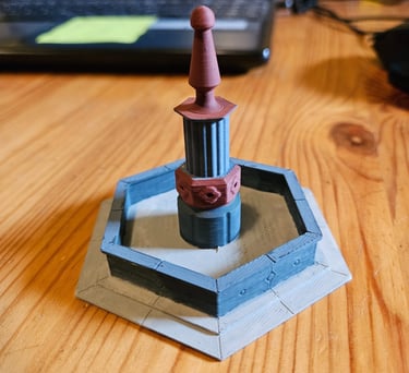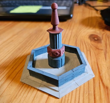 Der Brunnen ist 90mm breit, 78mm tief und 70mm hoch. Gedruckt wurde er einfarbig und dann bemalt. Er ist nicht dafür geeignet mit richtigem Wasser verwendet zu werden!