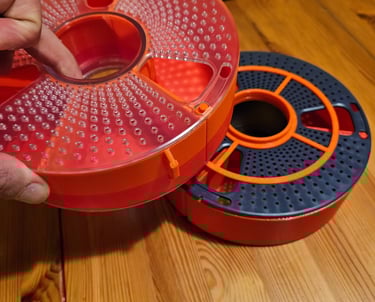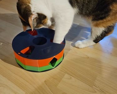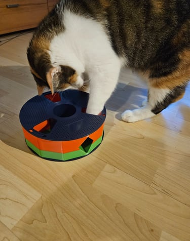 Gegen lange Weile und zur Förderung der Geschicklichkeit können in den 6 Kammern Leckerlies versteckt werden.